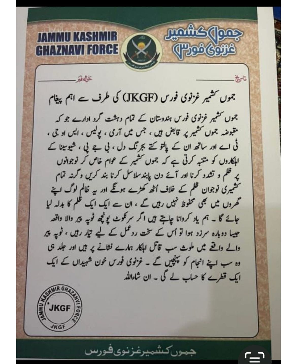 The claim by the Jammu Kashmir Ghaznavi Force underscores the persistent challenges posed by militancy in the region and highlights the urgent need for coordinated efforts to combat extremism and ensure the safety and security of all residents.